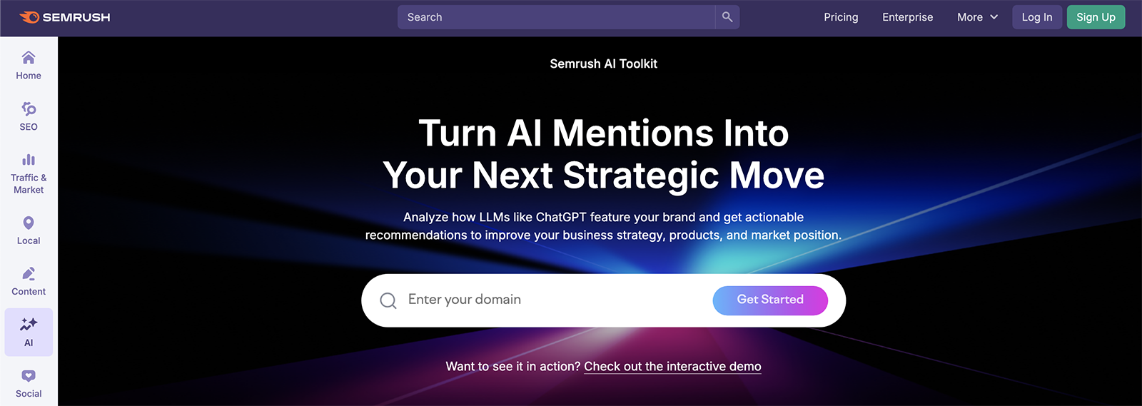 - Semrush AI Toolkit analyzes how AI answer engines feature your brand and offers recommendations to improve your content strategy and position.