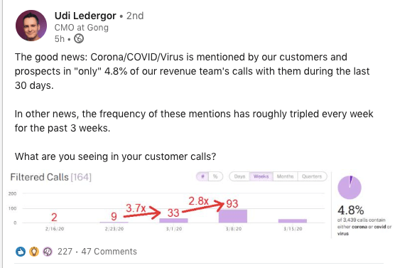 Here’s a great example from the CMO of Gong.io, a sales intelligence tool. He posted something interesting that is relevant to today’s Coronavirus pandemic. Bonus: it was about their product