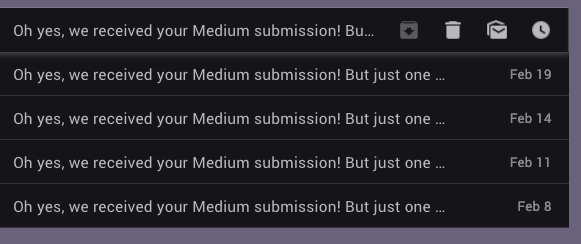 I have a lot more of those screenshots that I’ll choose not to share. I could make a whole post with just rejection letters. I’m fueled by rejection, and my tank is full right now.